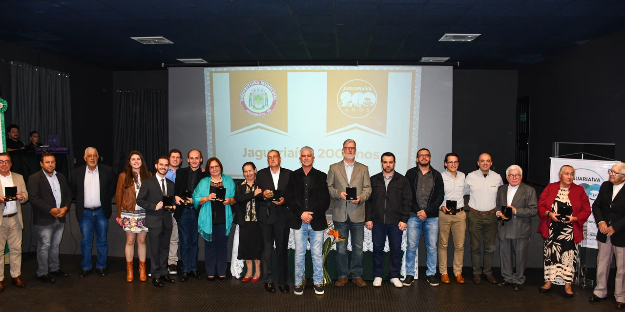 COM ASSESSORIAS - Em meio às festividades que celebram o Bicentenário de Jaguariaíva, a Prefeitura Municipal, através das secretarias de Comunicação Social (SECOM) e de Governo (SEGOV), e apoio da Educação, Cultura, Esporte e Lazer (SMECEL), homenageou ilustres cidadãos e empresas. O evento aconteceu na noite de sexta, 25, no Cine Teatro Valéria Luercy, e reuniu homenageados, autoridades, entre elas a prefeita Alcione Lemos, vice-prefeito Adilson Passos Félix, secretários e convidados.