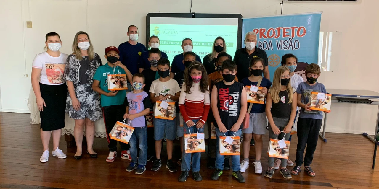 COM ASSESSORIAS - A parceria entre a Secretaria Municipal de Educação e Rotary Club de Palmeira propiciaram a entrega de óculos do Projeto Boa Visão, na data de hoje, 22 de dezembro de 2021, no salão da Secretaria Municipal de Educação, com a presença dos alunos e responsáveis. Esse projeto visa à saúde ocular das crianças matriculadas nas escolas públicas municipais, tendo o objetivo de identificar deficiências oculares e corrigir ou diminuí-las com o uso de óculos. O projeto Boa visão começa com um exame preventivo, realizado nas dependências da escola, aplicado em todas as crianças matriculadas. É o teste de triagem ou acuidade visual, encaminhados a consultas com oftalmologistas: Carlos Garletti, Marcos Tulio, Mauricio Moro, Adriana Gorski. Os alunos tiveram a oportunidade de escolher o modelo dos óculos, o que fizeram com muita alegria e satisfação. Devido a pandemia, teve início em outubro deste ano e finalizando com a doação de óculos as crianças. O Projeto Boa Visão é coordenado pela rotariana Geise Begosso e só é possível com a doação de colaboradores. Nessa etapa foi possível promover a participação de sete escolas do município, com óculos entregues a quinze crianças.