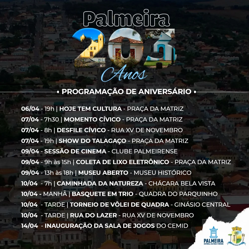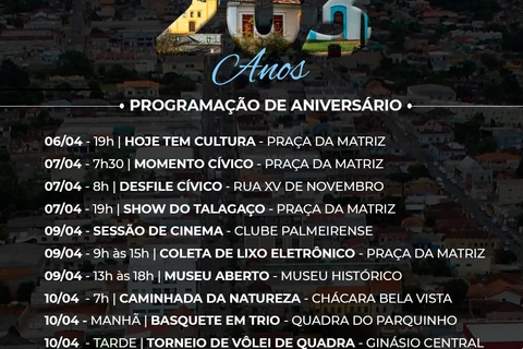 O último evento da programação comemorativa aos 203 anos de Palmeira acontece no dia 14, com a inauguração da nova sala de jogos do Centro Municipal do Idoso, na Rua Luiza Trombini Malucelli, nº 25, em horário ainda não definido.