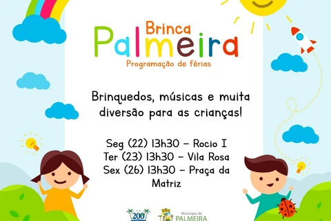 Joanassi também relatou que a realização do 'Brinca Palmeira' em três pontos distintos do município pretende descentralizar as atividades e levá-las gratuitamente ao maior número de crianças possível. "Fica nosso convite para que os pais ou responsáveis levem às crianças para aproveitar este evento que com certeza será bastante divertido", disse.