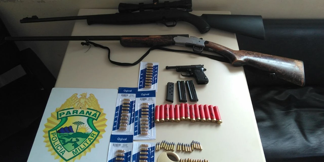 Com o trabalhador, de 29 anos de idade, foram encontradas uma espingarda calibre 28, um rifle calibre 22 e uma pistola calibre 6.35, além de diversas munições. Ele foi preso pela apropriação indevida da madeira e ainda pela posse irregular das armas de fogo.