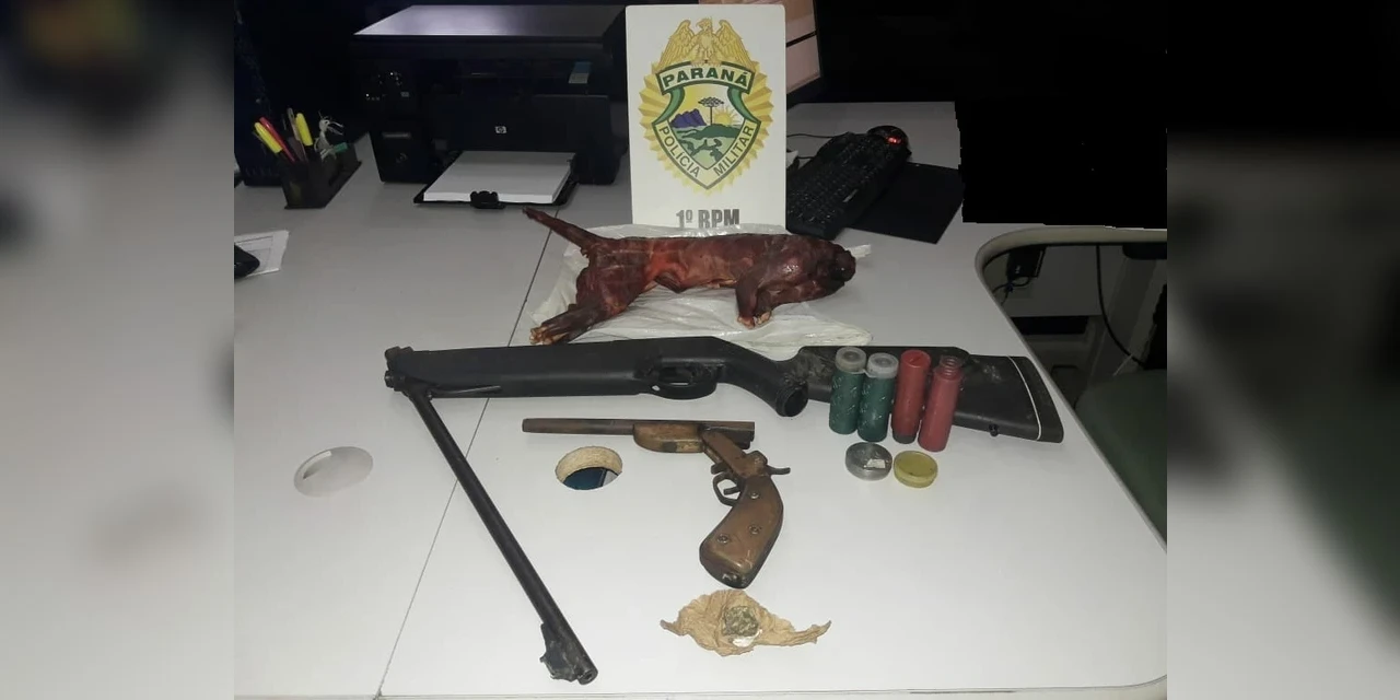 Na casa do suspeito, localizada na comunidade de Vileiros, foram encontrados uma garrucha calibre 40 e uma espingarda de pressão, além de uma motocicleta que estava com a numeração do chassi e motor suprimida. Na geladeira da residência a PM encontrou um animal de caça, posteriormente identificado como um quati.