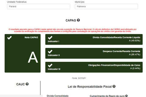 IMPRENSA/Palmeira - O Município de Palmeira recebeu classificação máxima no sistema de avaliação da capacidade de pagamento (CAPAG) do Tesouro Nacional. Com classificação "A" o município recebe o aval para realizar operações de crédito como financiamentos em investimentos de longo prazo.