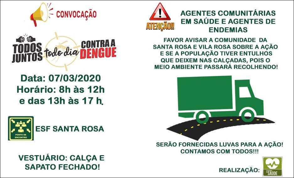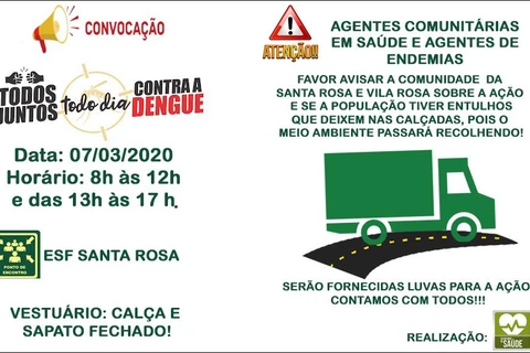 A ação contará com a participação de agentes comunitários de saúde, agentes de endemias e cerca de 40 militares do Exércitos, porém a população em geral também pode participar voluntariamente da ação. Para isto basta comparecer no horário de início das atividades na Estratégia de Saúde da Santa Rosa, vestido de calça e sapato fechado. Luvas serão fornecidas pela Secretaria de Saúde.