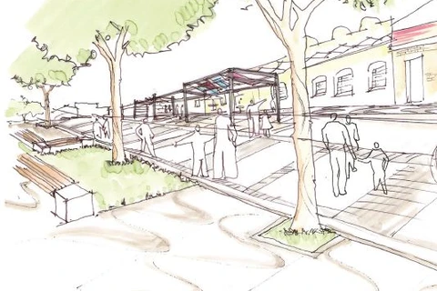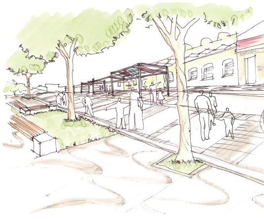 Ao longo das edificações existente, basicamente comerciais, a proposta é a implantação de uma estrutura metálica composta por pergolados, tendas e vazios. Além de embelezar, criar espaços de convivência e estimular o comércio voltado a gastronomia, as estruturas criam agradáveis áreas de sombreamento, possibilitando a colocação de mesas, cadeiras e guarda sóis para acomodação dos usuários. Os pergolados serão acompanhados de canteiros nas suas proximidades, possibilitando o cultivo de plantas tipo trepadeiras que percorrerão a estrutura, adicionando cor ao cenário, através de flores e folhas.