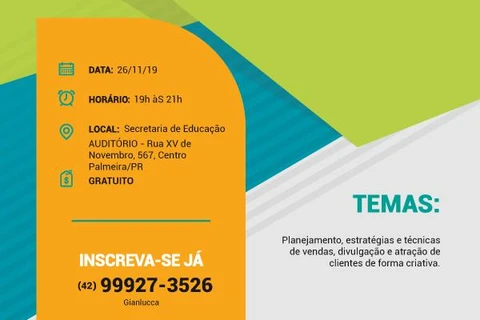 IMPRENSA/Palmeira - A Sala do Empreendedor promove uma palestra gratuita na próxima terça-feira (26) com o tema 'Vendas para o Natal'. Os empresários receberão informações sobre planejamento, estratégia e técnicas de vendas, além de divulgação e atração de clientes de forma criativa.