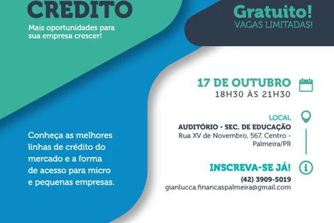 IMPRENSA/Palmeira - Na próxima quinta-feira (17) microempreendedores individuais (MEIs) e microempresas (ME) poderão participar do Seminário de Crédito, evento realizado pela Sala do Empreendedor de Palmeira, em parceria com o Serviço Brasileiro de Apoio às Micro e Pequenas Empresas (Sebrae), para apresentar as melhores linhas de crédito e a forma de acesso para micro e pequenas empresas.