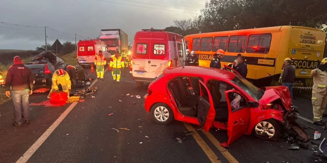 Um grave acidente, envolvendo um ônibus escolar, causou três mortes na BR-369, em Corbélia, no oeste do Paraná, na manhã desta segunda-feira (28). O coletivo bateu de frente com um Citroën C4, que era ocupado por cinco pessoas da mesma família. Na sequência, um Volkswagen Gol também atingiu o automóvel da família.