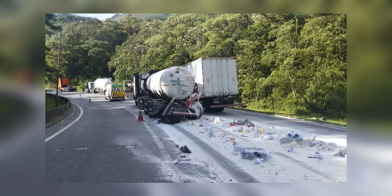 De acordo com a polícia, uma das carretas transportava ácido clorídrico, mas não houve vazamento. Parte da carga de farinha de um dos veículos ficou espalhada pelo chão.