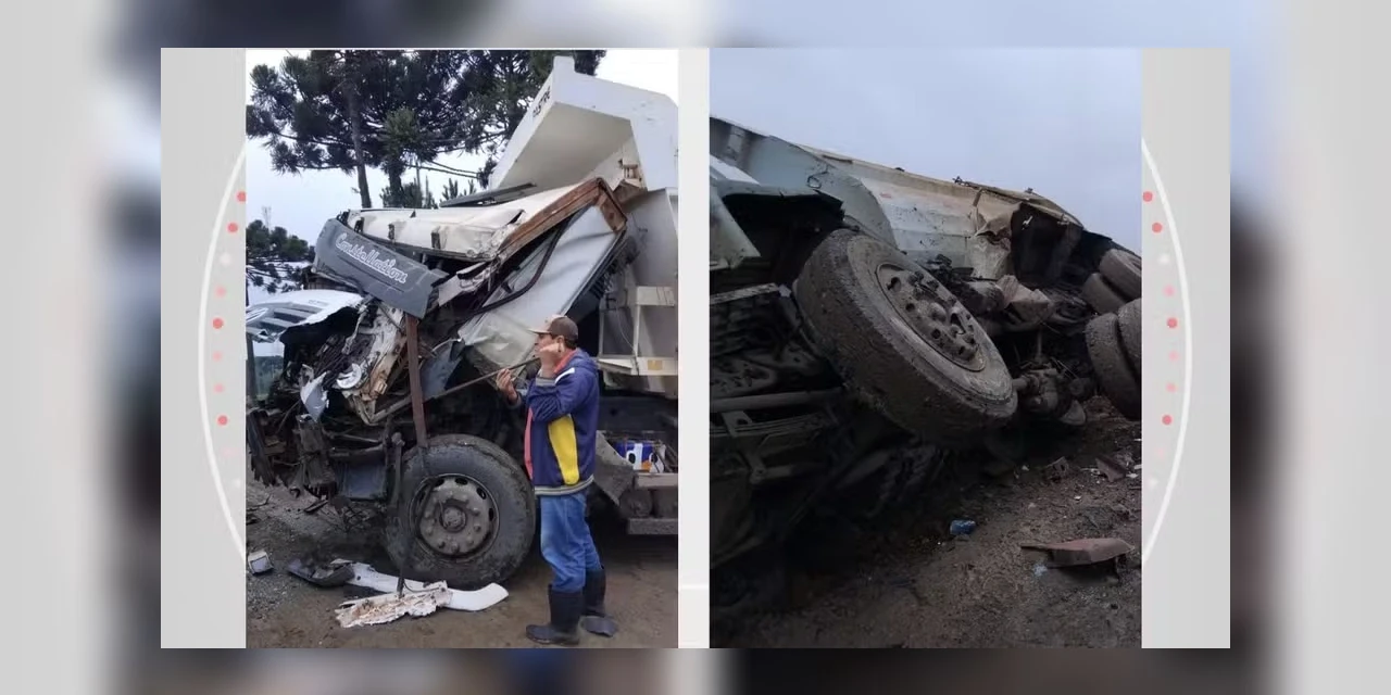 O veículo bateu contra outro caminhão, que tombou sobre um barranco. O motorista teve ferimentos leves e conseguiu sair sozinho da cabine, segundo o Corpo dos Bombeiros.