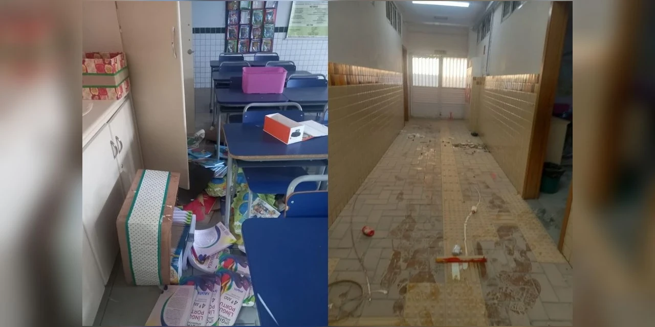Em imagens registradas por agentes do município, é possível ver sujeira pelos corredores, salas e pátio. Além disso, materiais didáticos foram revirados e destruídos e vidro de portas e janelas foram quebrados. Veja acima.