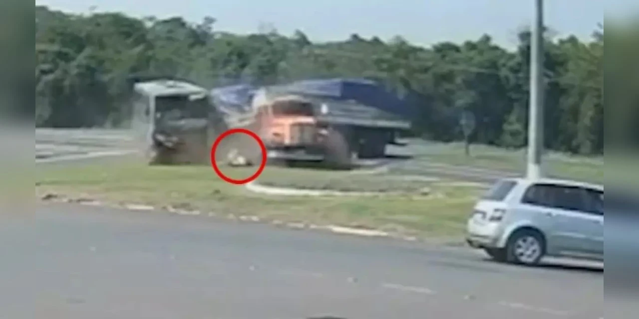 O vídeo abaixo mostra o momento em que um ônibus e um caminhão se encontram em um cruzamento, o veículo não consegue frear e atinge a carreta. Após o acidente, um homem cai do ônibus, mas se levanta na frente do coletivo logo em seguida.