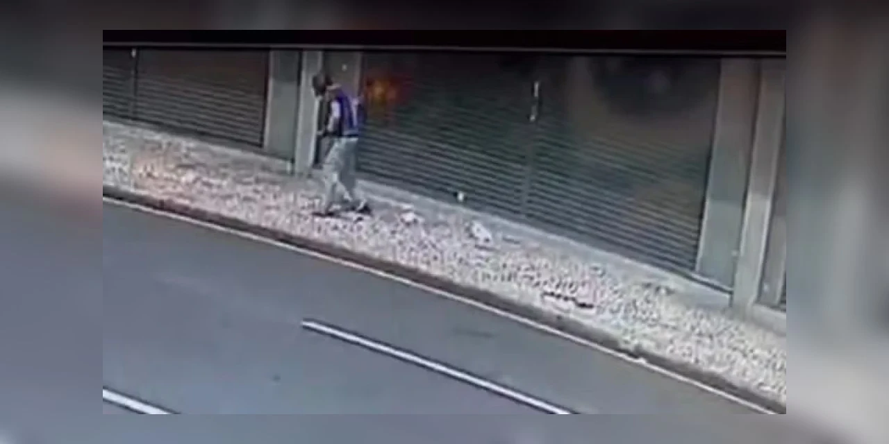 Nas imagens é possível ver o suspeito se aproximando e fazendo um movimento próximo ao rosto da vítima, de 43 anos, que estava deitada na calçada. Logo após, o homem se agita, fazendo movimentos como se tentasse tirar algo da região do rosto. Em seguida, é possível ver chamas no tórax dele.