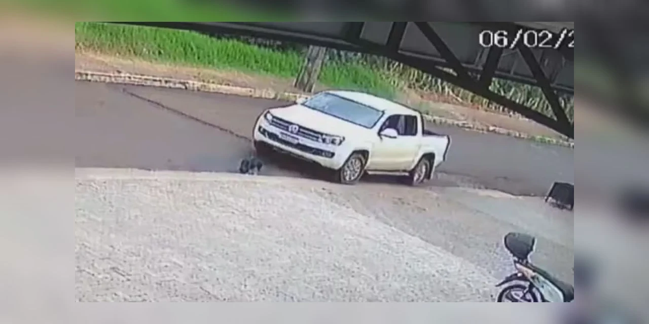 Imagens de uma câmera de segurança mostram o momento em que a cadela anda sobre uma calçada. Na sequência, uma caminhonete aparece e o motorista muda de pista, se aproximando do animal, que tenta fugir, mas acaba sendo atingido pelo pneu dianteiro do carro.