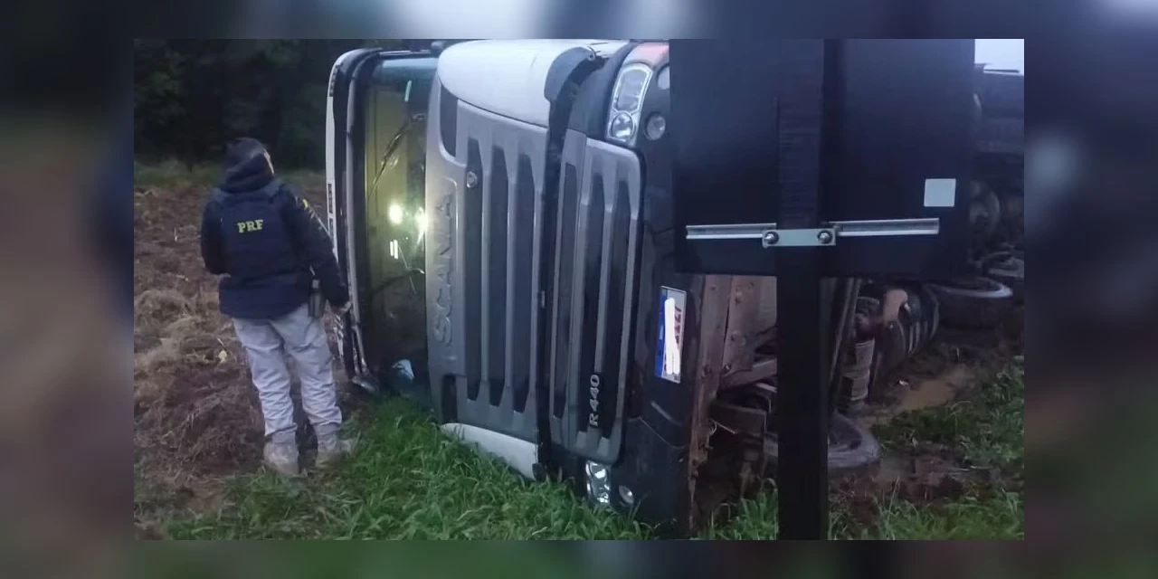 A PRF destaca que o caminhoneiro que tombou na rodovia estava dirigindo bêbado, a caminho do porto de Paranaguá.