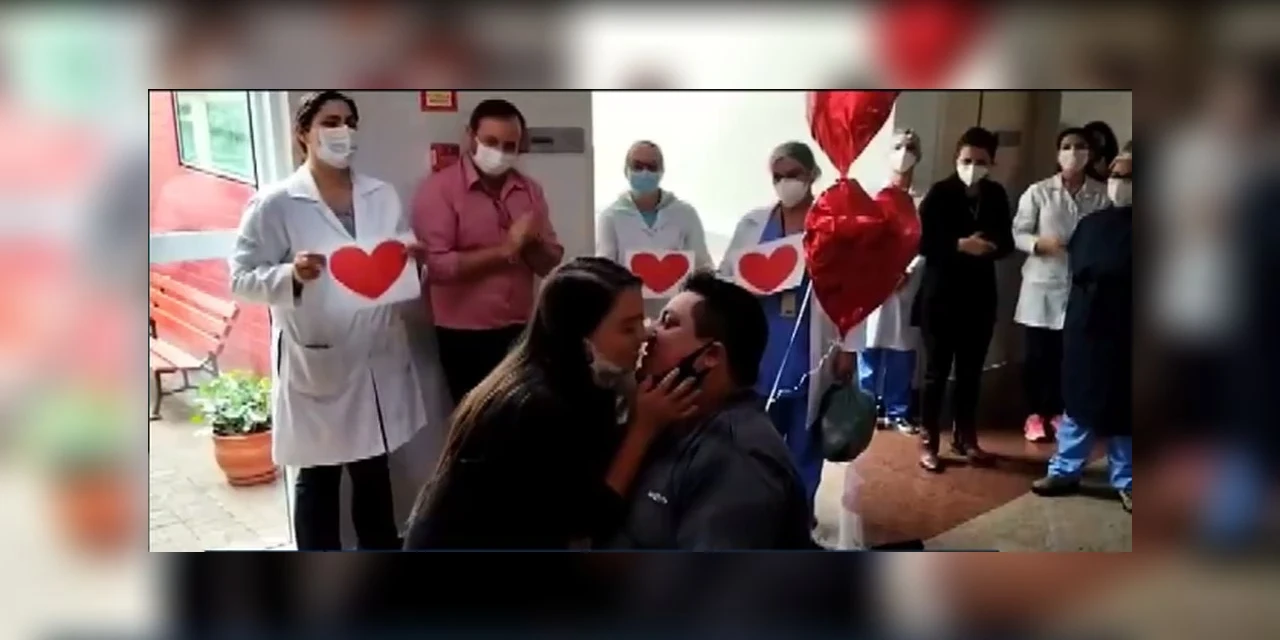 A vontade de pedir a namorada em casamento estava guardada há 12 anos. Ao vencer a Covid-19, Carlos decidiu que não iria mais esperar para fazer o pedido. Ao receber alta e ainda no corredor do hospital, ele fez o tão esperado pedido.