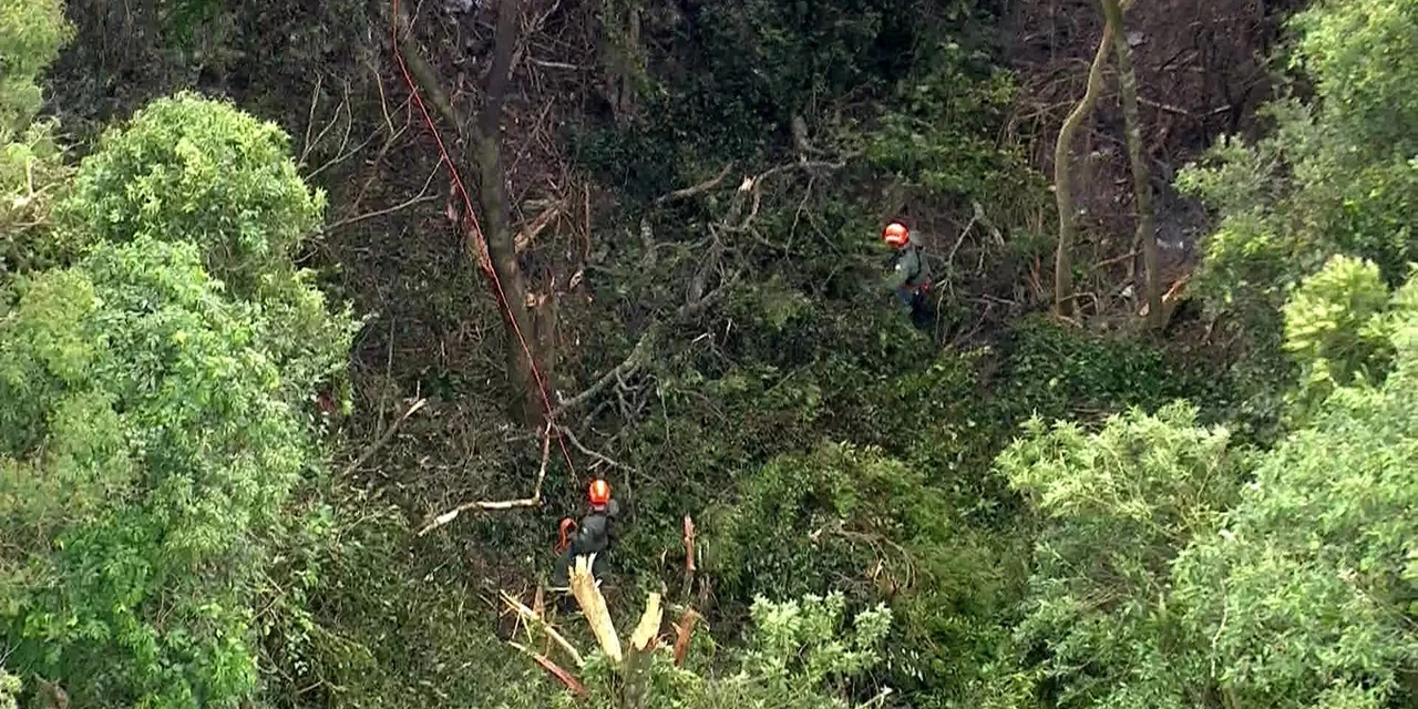 Oito equipes do Corpo de Bombeiros foram enviadas ao local, que é de mata fechada e difícil acesso. Por isso, os socorristas tiveram de usar um helicóptero para chegar até lá e descer de rapel (técnica com uso de cordas).