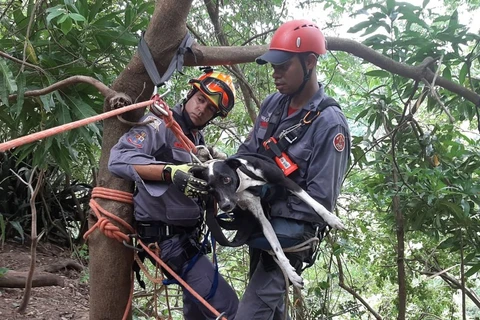 Na manhã desta terça-feira (7), os voluntários pediram ajuda do Corpo de Bombeiros e, com um rapel, conseguiram trazer a cachorra de volta.