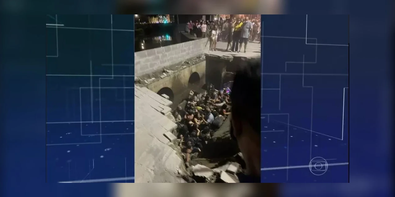 Uma calçada cedeu e pessoas caíram em um rio em Joinville, no Norte catarinense, na noite desta segunda-feira (22). O caso ocorreu durante uma apresentação de Natal. A prefeitura afirmou que não há vítimas graves. Polícia Militar e bombeiros atenderam a ocorrência. Um vídeo mostrou o momento exato do acidente.