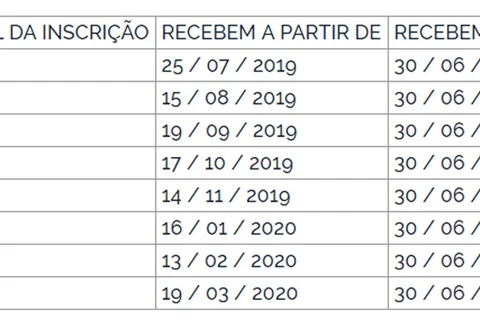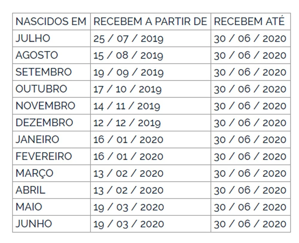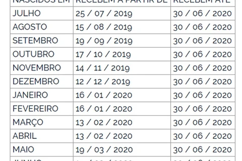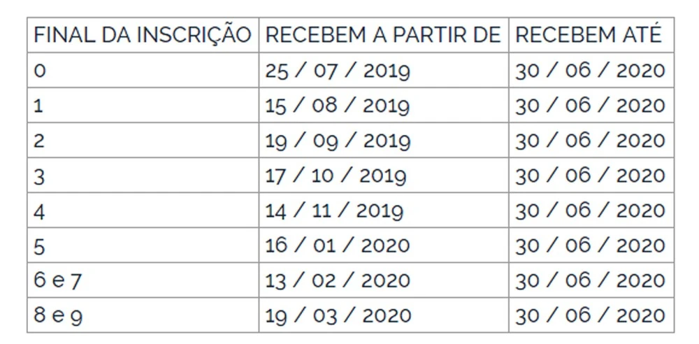 Quem nasceu nos meses de julho a dezembro ou tem número final de inscrição entre 0 e 4 recebeu o benefício ainda no ano de 2019. Já os nascidos entre janeiro e junho e com número de inscrição entre 5 e 9 receberão no primeiro trimestre de 2020. Em qualquer situação, o recurso ficará à disposição do trabalhador até 30 de junho de 2020, prazo final para o recebimento.