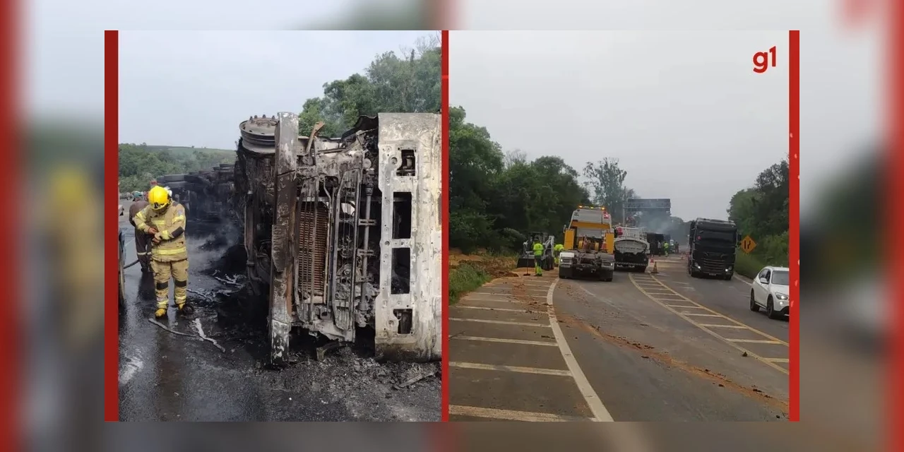 De acordo com informações da Polícia Rodoviária Federal (PRF), o caminhão tombou e uma caminhonete atingiu o tanque de combustível dele, que incendiou.