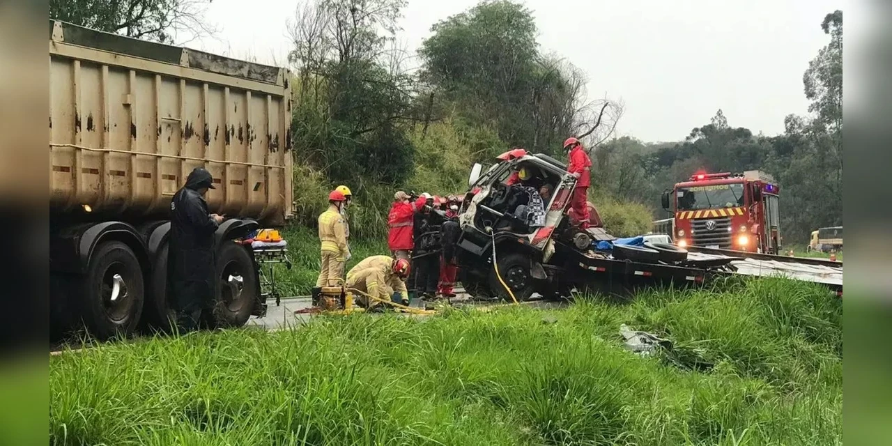 Um caminhoneiro de 70 anos ficou preso às ferragens após colidir contra outro caminhão na tarde desta quinta-feira (5) na BR-467, em Cascavel. O acidente aconteceu no quilômetro 99 da rodovia.