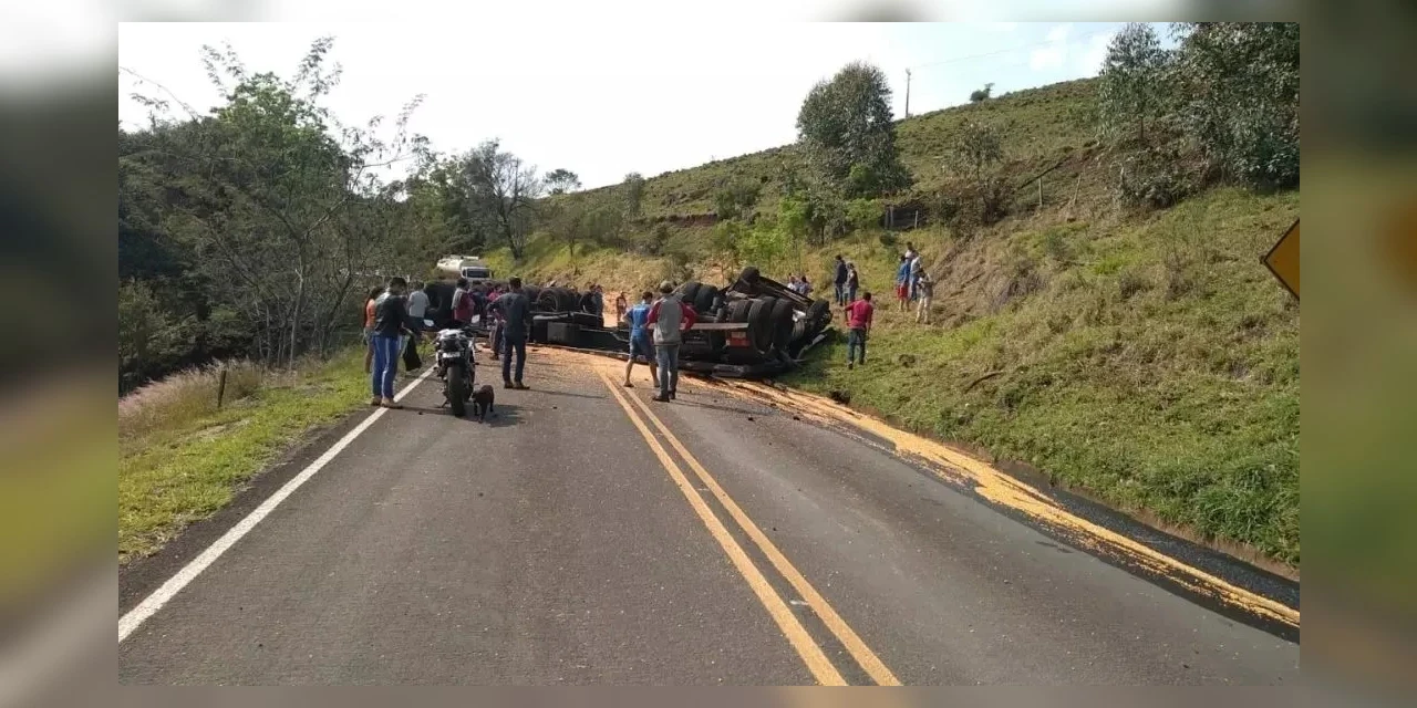 A carga de grãos que ele transportava se espalhou pela pista e a rodovia ficou completamente interditada até a tarde.
