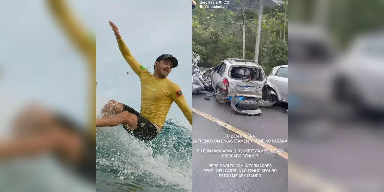 Theo Fresia, surfista profissional e campeão carioca, foi uma das pessoas envolvidas no engavetamento de 15 veículos na BR-376, em Guaratuba, no Litoral do Paraná. O acidente foi registrado na manhã de domingo (2) e o carro de Fresia ficou destruído. Segundo o surfista, ele não tinha seguro e perdeu o automóvel, mas as pranchas ficaram intactas.