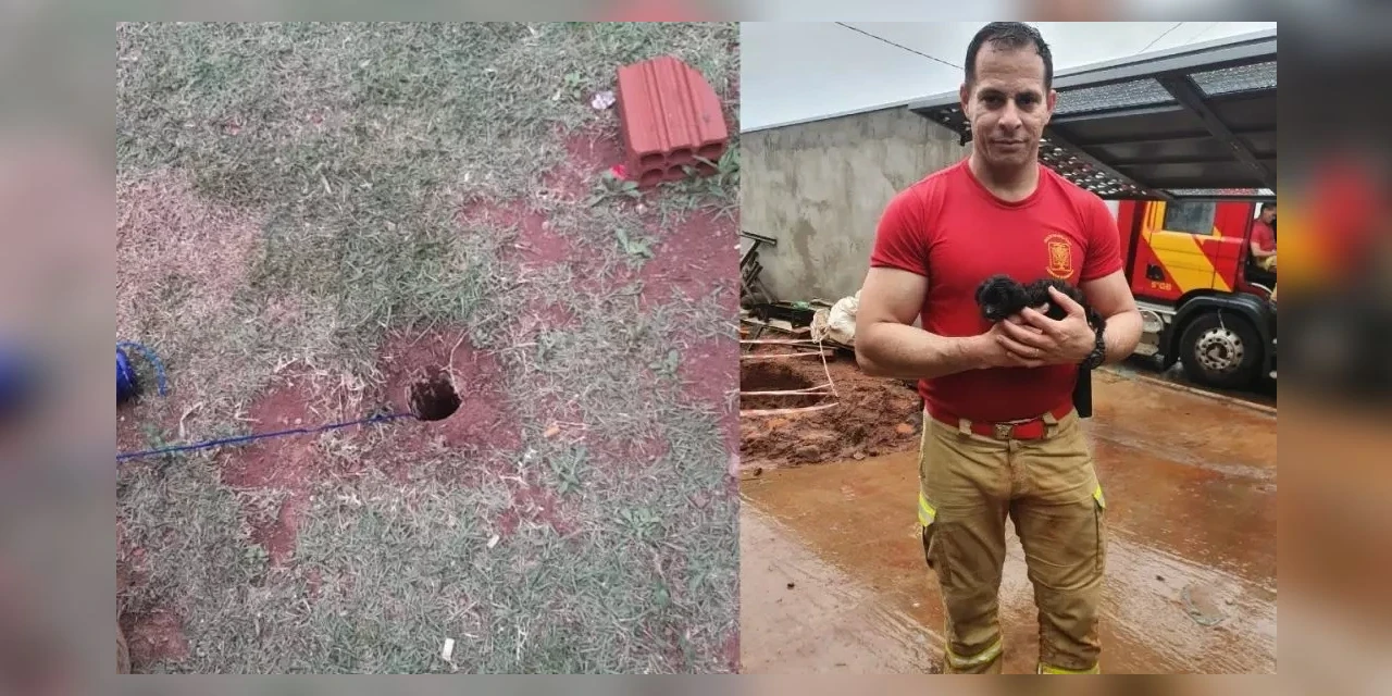 Um filhote de cachorro foi resgatado pelo Corpo de Bombeiros de dentro de uma fossa séptica de aproximadamente 10 metros de profundidade em Floraí, no noroeste do Paraná. O animal foi resgatado com vida e passa bem.