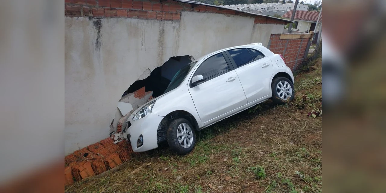 O motorista do veículo perdeu o controle da direção quando fazia uma curva, saiu da rua e bateu contra o muro da residência.
