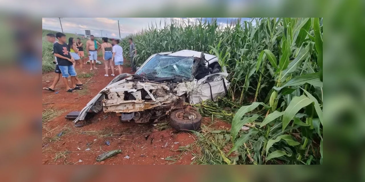 Com o impacto da batida, o veículo, que ficou destruído, saiu da pista e atingiu uma plantação de milho.