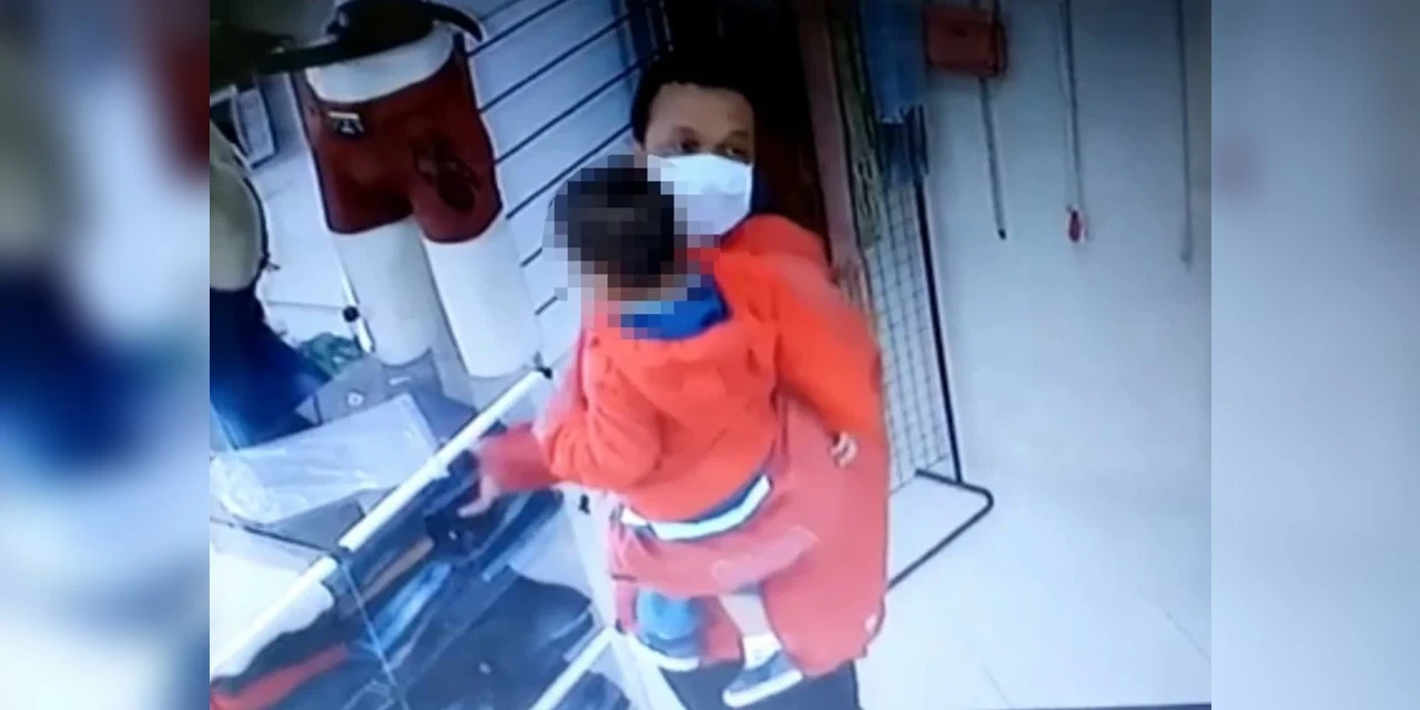 Nas imagens é possível ver o momento que o homem com a criança no colo, pega algumas calças e esconde dentro da jaqueta. Logo em seguida, a mulher tenta pegar calças na mesma vitrine, porém desiste. Em um momento oportuno consegue pegar outras peças.