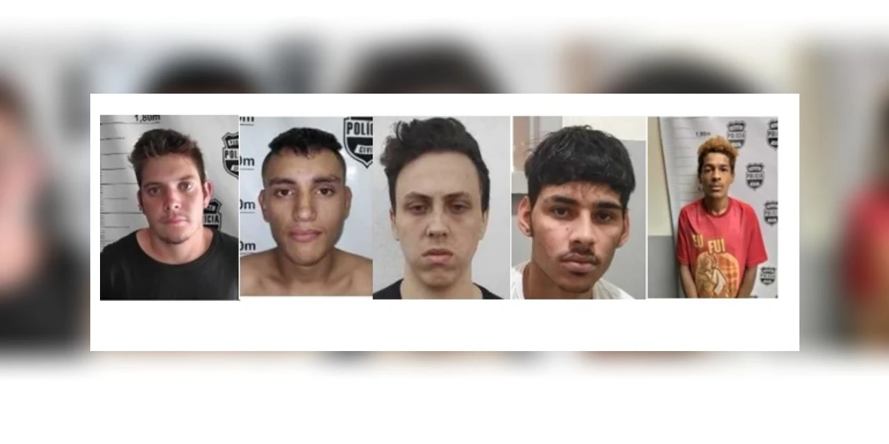 Os procurados são (ordem da foto da esq. para dir.): Luiz Fernando Batista de Lima, Mateus Santos de Morais, Lauro José da Silva Junior, Lucas Mateus Mores e Claudio Mateus Afonso Ramos dos Santos.