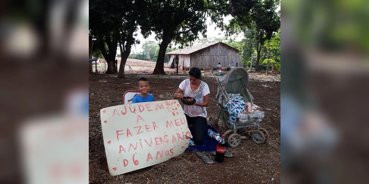 Sem nunca ter ganhado uma festa de aniversário, Gabriel Zacarias Mann, de 5 anos, quis que em 2020 a data fosse diferente. Com os pais desempregados e sem condições de pagar uma festa, ele teve a ideia de pedir ajuda para quem passava pela PR-497, em São Miguel do Iguaçu, no oeste do Paraná, com um cartaz improvisado.