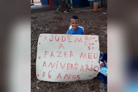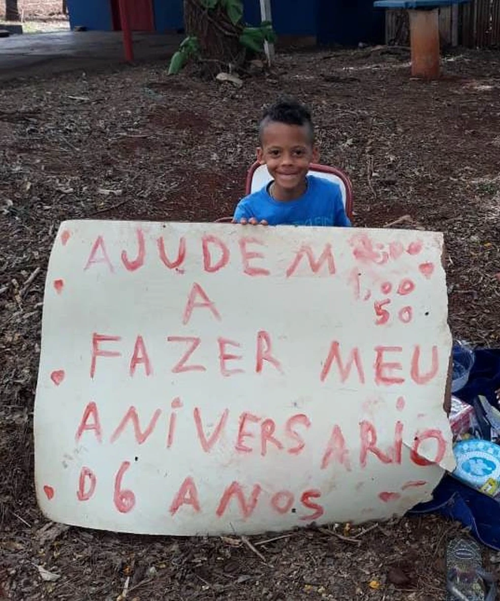 Nas pequenas mãos de menino, ele segurava a mensagem: "Ajudem a fazer meu aniversário de 6 anos." O cartaz, escrito pela mãe a pedido dele, sugeria que as pessoas dessem R$ 0,50, R$ 1 ou R$ 2 para a festinha.