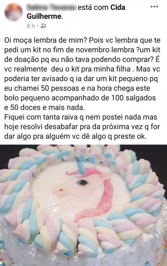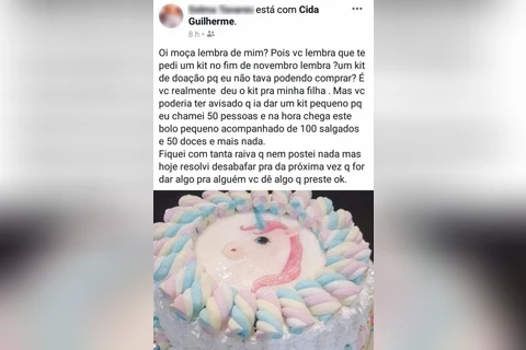 A atitude da mulher revoltou milhares de pessoas. Na publicação, ela escreve para a Cida que “quando for dar algo para alguém, dê algo que preste”. A Cida relatou que o contato com a mulher aconteceu após ter publicado em seu Facebook, no fim do ano passado, fotos do seu trabalho e os valores. “Ela estava online e entrou contato comigo pedindo ajuda. Disse que estava desempregada e que o marido também, que a filha iria fazer aniversário, e não tinha nem um bolinho para cantar parabéns”, conta.