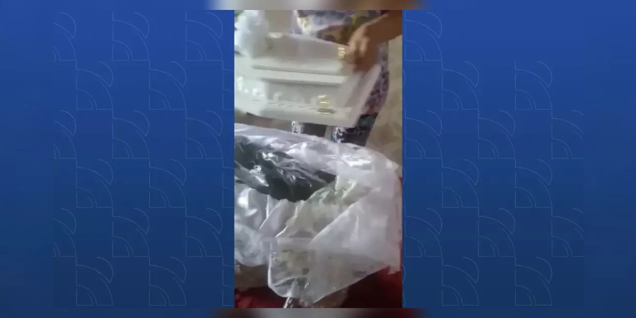 Em um vídeo gravado no momento da descoberta mostra os detalhes da sacola que estava dentro do caixão.