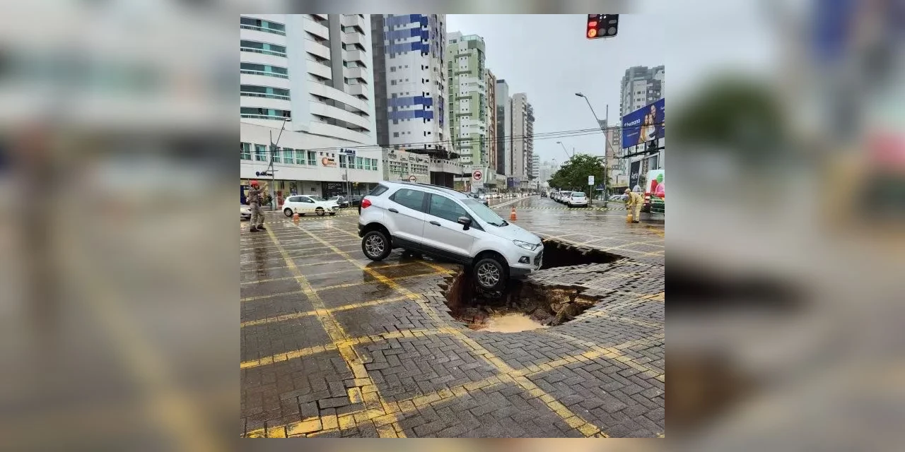 Uma motorista levou um grande susto na manhã desta terça-feira (18), quando teve seu carro quase engolido por uma cratera que se abriu no meio de um cruzamento movimentado do novo centro de Maringá.