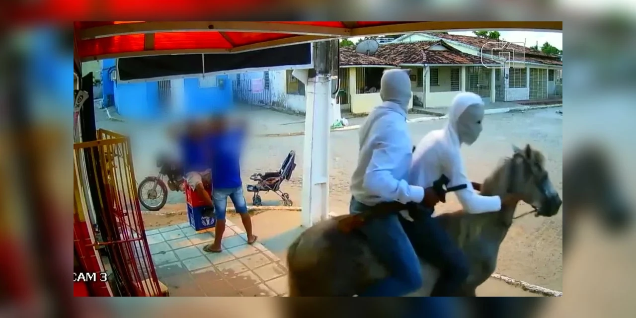 Uma câmera de segurança flagrou o momento em que dois assaltantes a cavalo chegaram para roubar um mercadinho localizado na praia de Carne de Vaca, no município de Goiana, no Litoral Norte de Pernambuco, e depois fugiram. O crime aconteceu na tarde da quinta-feira (10), segundo a Polícia Militar (veja vídeo acima).