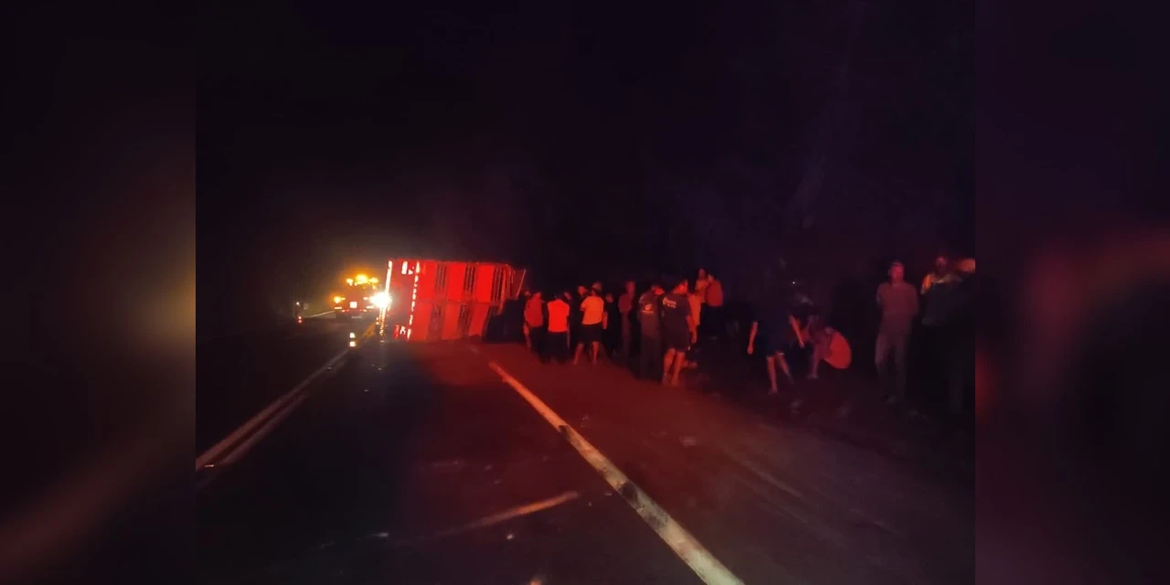 De acordo com a Polícia Rodoviária Federal (PRF), o motorista do caminhão perdeu o controle da direção em uma curva e acabou tombando. Ele teve ferimentos leves.