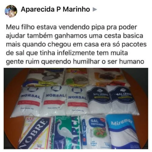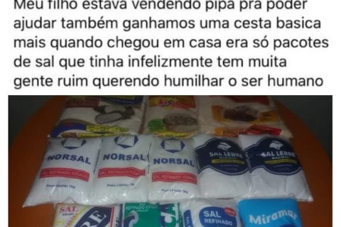 A Marcela Marinho ganhou uma cesta básica de uma desconhecida, mas quando abriu tinha apenas pacotes de sal e farinha. Isso a deixou arrasada.