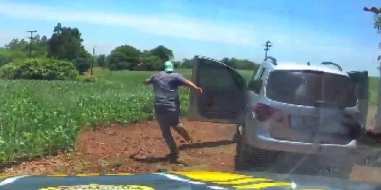 Os dois suspeitos, então, pularam do carro em movimento para tentar fugir em meio a uma plantação de soja.