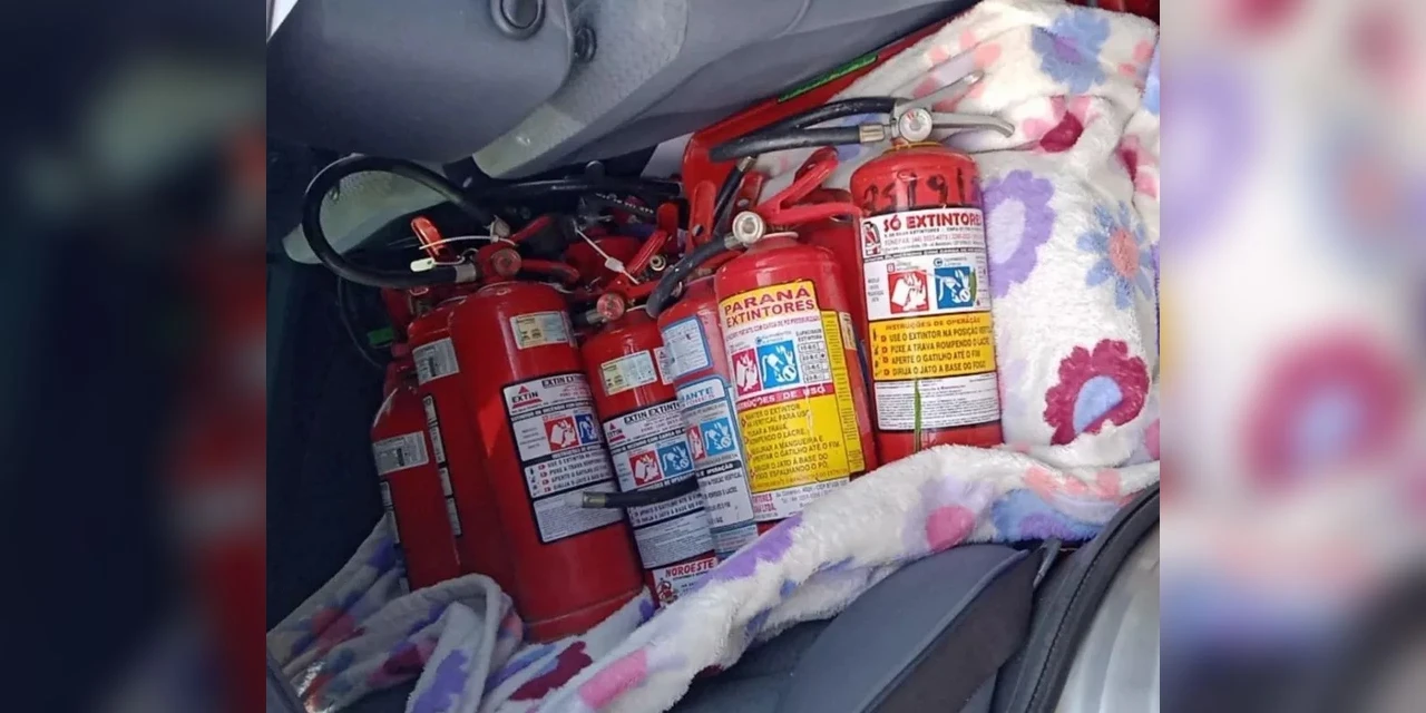 A PM começou a fazer buscas pela região e encontrou o homem em um carro com nove extintores.