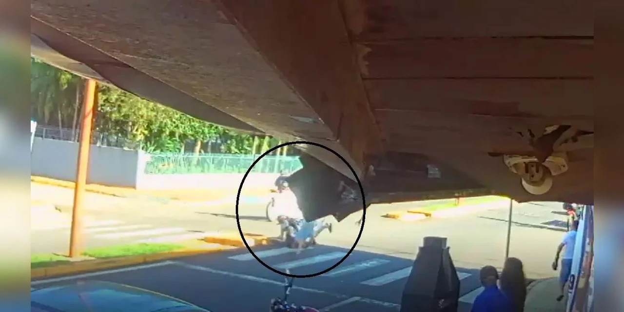 Na imagem, é possível ver no canto da tela o motociclista terminando uma manobra de empinar. Quando ele tocou a roda da frente no solo novamente, já estava quase em cima da idosa. Não conseguiu freiar ou desviar e bateu na mulher. Ainda passou com uma das rodas em cima dela.