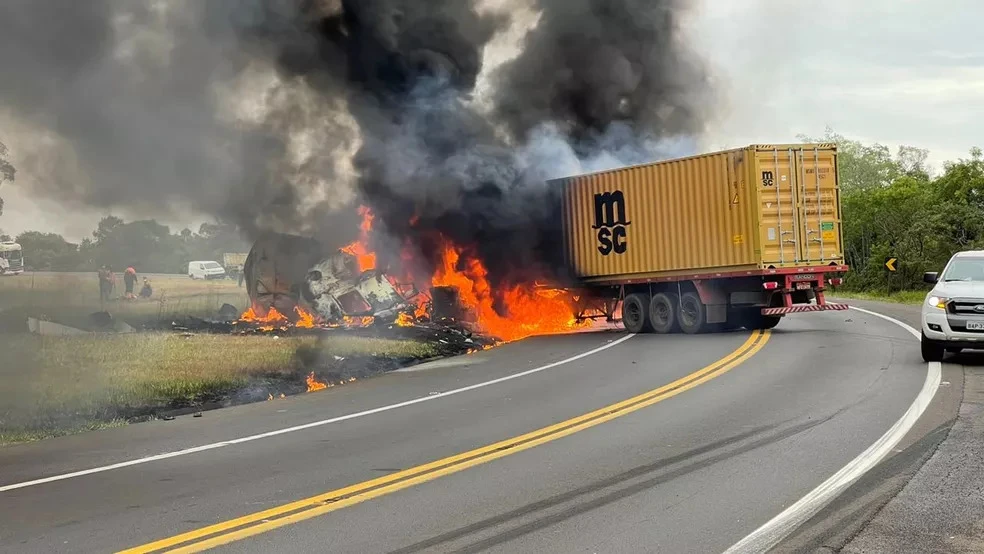 Em seguida, um segundo caminhão se envolveu no acidente. A PRE disse que chovia no momento da batida.