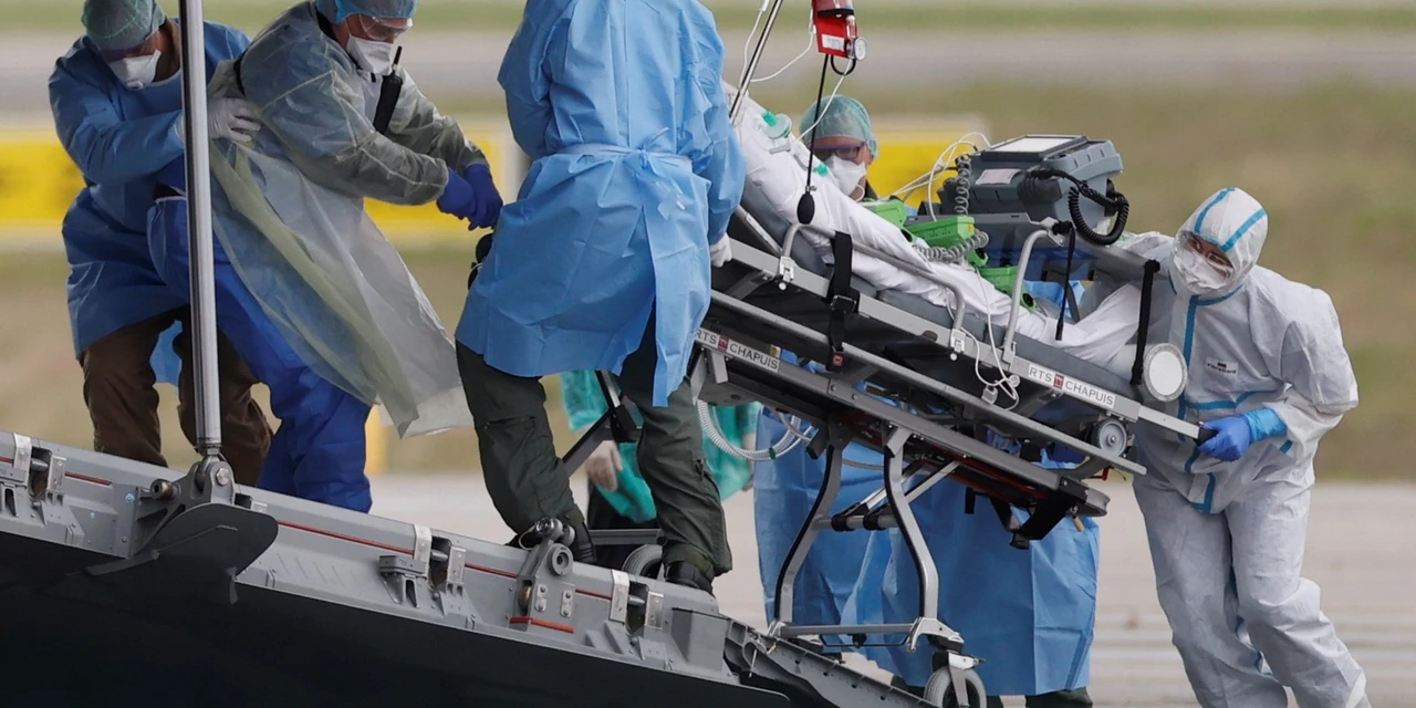 Paciente infectado com Covid-19 é colocado em avião militar alemão para ser transferido de Strasbourg, na França, para Ulm, na Alemanha, neste domingo (29). (Foto: Christian Hartmann/Reuters)