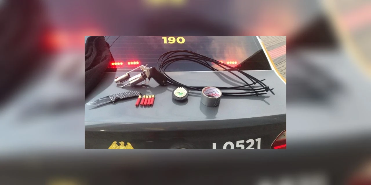 Quando foi preso na tarde de ontem, em seu carro foram encontrados um revólver Taurus calibre 36, uma faca, fita adesiva, braçadeiras para algemar e roupas íntimas femininas.