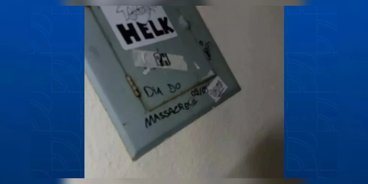 Entre domingo (1º) e segunda-feira (2), mensagens circularam com informações sobre um “massacre” que estaria marcado para um colégio estadual de Cambé, no norte do Paraná. Isso porque estaria escrito a data em uma cabine de banheiro feminino: “Dia do massacre 02/05” (imagem).