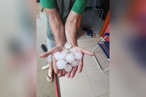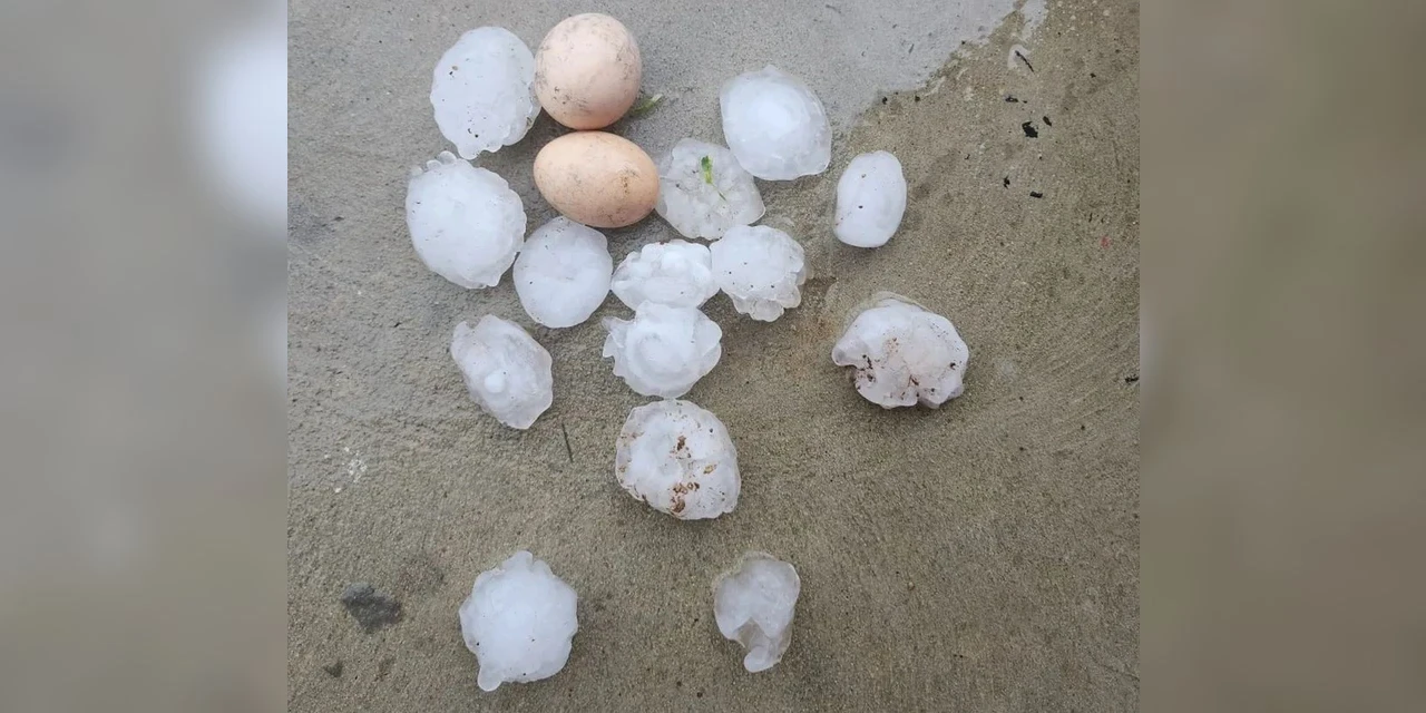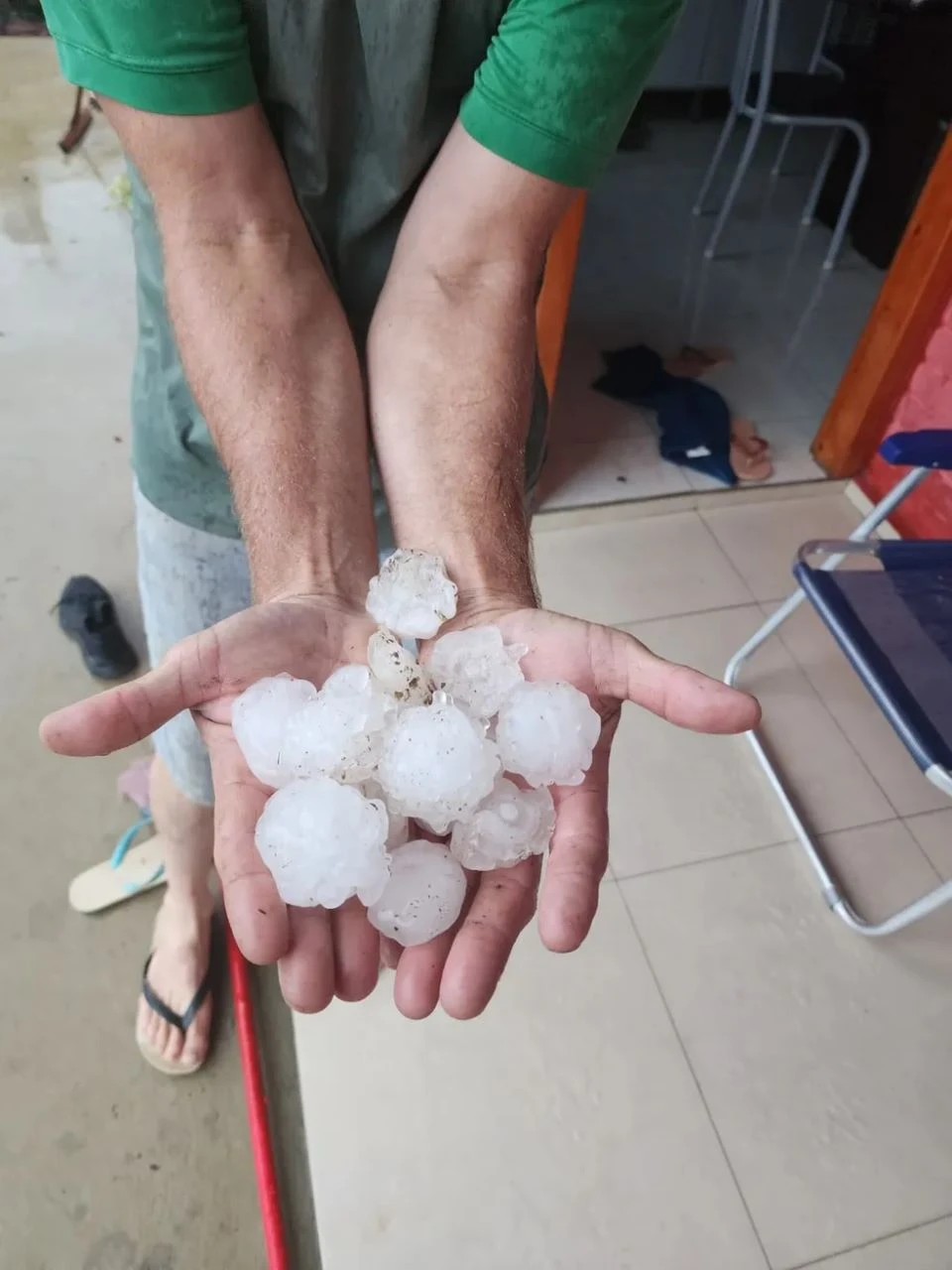O telespectador da RPC Anderson Rebinski teve a propriedade atingida pelo granizo e registrou imagens da pedra de gelo com tamanho semelhante a de um ovo. Foto acima.