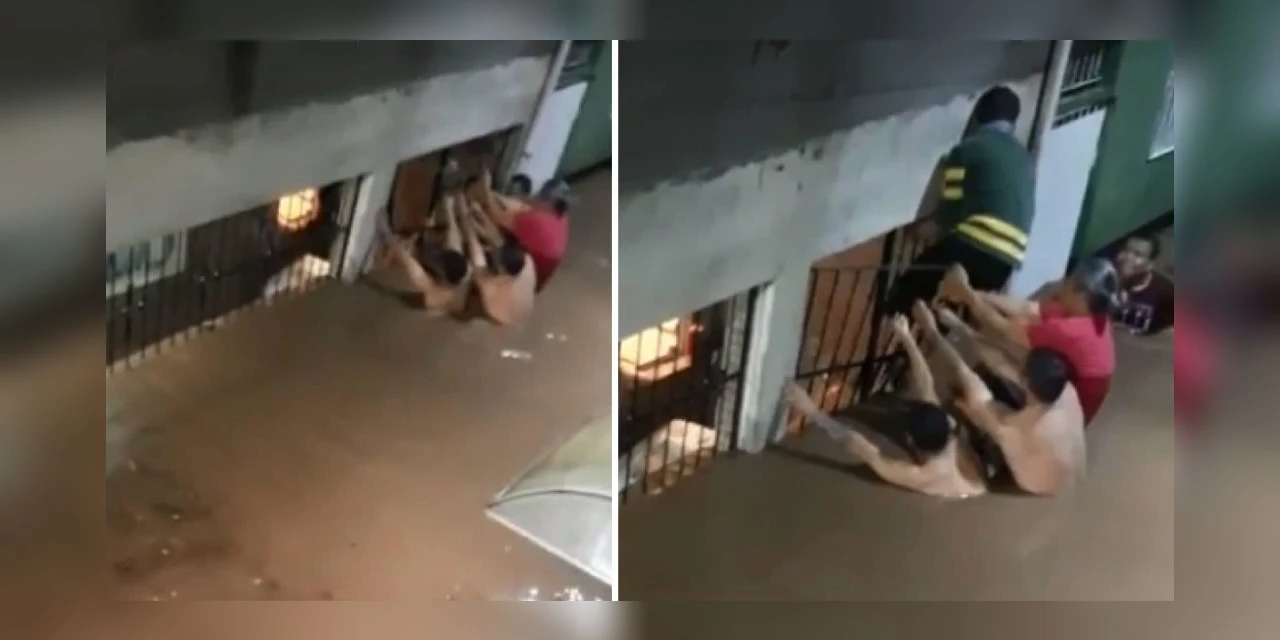 Ela segura a grade com toda força e, em um determinado momento, chega a subir para puxar o morador, que estava com a casa quase toda inundada.